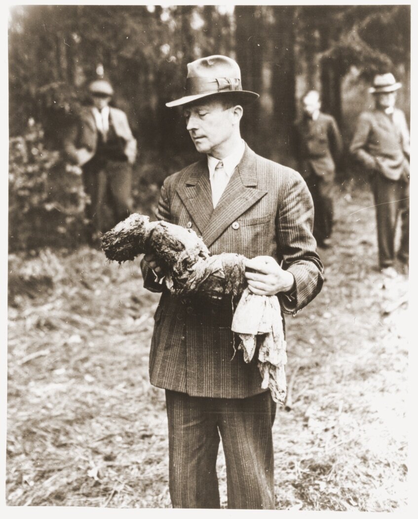 (На фотографии запечатлен мизерный процесс денацификации: респектабельные господа нюхают смерть от рук нацистов).