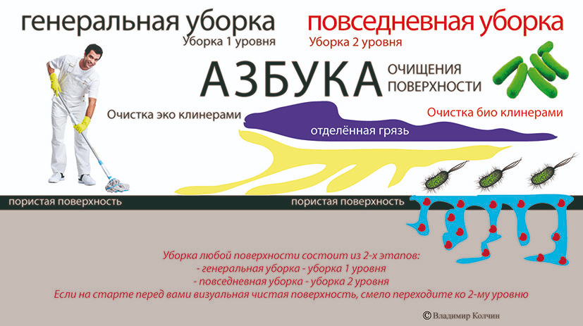 Уборка любой поверхности состоит из двух этапов: генеральная уборка 1-го уровня и повседневная регулярная уборка 2-го уровня. С какого уровня вам следует начинать? Это зависит от постановки задачи. Зависит от количества грязи перед уборкой. Если на старте перед вами визуально чистая поверхность, смело начинайте со 2-го уровня. Как правило, подобные "чистые визуально" поверхности содержат аккуратные хозяйственники. Генеральная уборка требуется, когда поверхности запущены сильно и здесь на первом этапе пока речь не идёт о микробной очистке, сначала нужна жесть и сильная уборка. Это всё надо понимать на старте. Рассмотрим сначала и по порядку.
