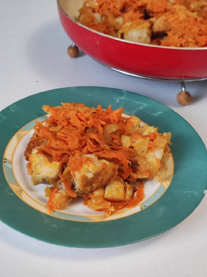 Ингредиенты: свежемороженой рыбы или 500 г филе рыбы, муки, соли, подсолнечного масла, Для маринада, морковь, луковица, томатного соуса, лимонного сока, сахара, соли (без верха), перец черный, воды