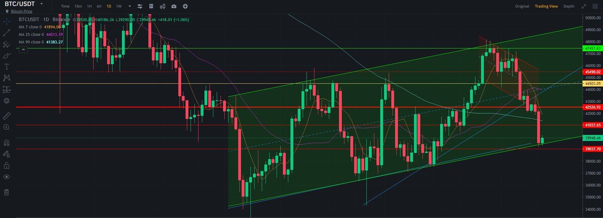 📉 Цена за 24ч. 1 (BTC) 40 125,67 $ -1.3% 2 (ETH) 3 020,36 $ -2.3% 3 (USDT) 1 $ 0.0% 4 (BNB) 406,92 $ -2.7% 5 (USDC) 1 $ 0.0% Как и писал вчера, BTC ушел ниже 41 000$ и отработал ключевую поддержку восходящего тренда 40 000$. На рынке "Чрезвычайный страх", но мы то знаем, что наступает время подбирать альты. Диапазоны торговли BTC 39 000$ - 41 000$. В общем продолжается корреляция между фондовым рынком и BTC, и пока-что ничего хорошего это не сулит, локальное дно на отметки 37 500$. Luna Foundation - под шумок на падении закупилась битком, доведя его до значения 39 897 BTC(почти $1,7 млрд). Конечная цель компании – вывести показатель биткоин-резервов на отметку $10 млрд, причем эта цель может быть достигнута уже в текущем году. Mastercard объявила о намерении приобщиться к метавселенной. Согласно информации, раз