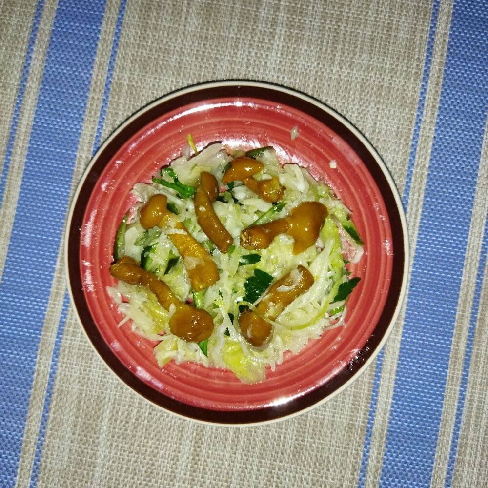 #пост Ингредиенты: нашинкованной свежей белокачанной Капусты, небольшой свежий Огурец, стол.л маринованные Грибы опята, по вкусу Соль, чёрный молотый Перец, Сахар, по вкусу Специи, яблочный Уксус Способ приготовления: Приготовить ингредиенты. Огурец помыть, обсушить вискозной салфеткой. С капусты снять верхние подвявшие листы, отрезать необходимое количество. Отмерить другие ингредиенты. Нашинковать огурец, капусту, сложить в миску, добавить грибы, перемешать. Посолить, добавить сахар, специи, залить уксусом, перемешать. Дать постоять минут 10. Выложить в салатник. Подавать к столу к вторым блюдам. Приятного Вам аппетита🍀!