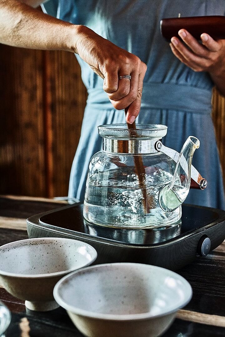 Проваривание пуэра - отличный способ заново познакомиться с вашим любимым сортом. А если вы приобрели новый сорт, то мы предлагаем вам изучать его, заваривая всеми имеющимися в вашем чайном арсенале способами - в том числе и провариванием на огне. Варка пуэра на огне - это исконный способ заваривания чая. Изначально чайные листья именно варили в котелке - так же, как лекарственные травы. В классических чайных трактатах так описана процедура проваривания чая: 1. Первый этап - кипячение воды. Воду для чая нужно использовать мягкую. В закипании есть три стадии: пузырьки, нити пузырьков поднимаются наверх, появляются большие пузыри. При заваривании чая главное - опускать в воду чай на второй стадии кипения, пока еще нет больших пузырей. На этой стадии слои воды с разной температурой начинают перемешиваться. Такая вода лучше всего помогает раскрыть полезные вещества, содержащиеся в чае . 2. Перед тем, как бросить в воду чай, нужно создать чайными щипцами водную воронку и потом опустить