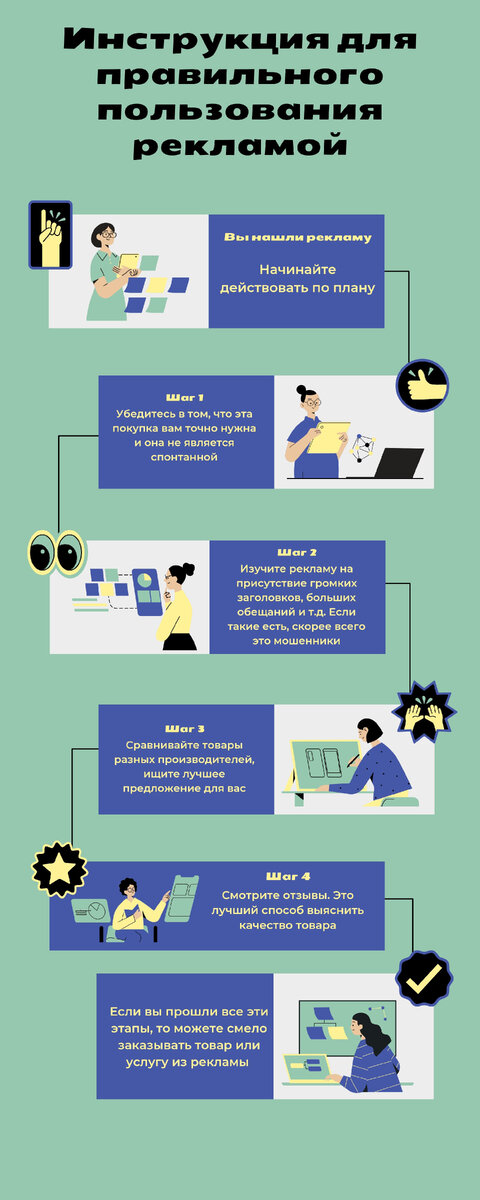 Хочу предложить вашему вниманию инструкцию по правильному использованию рекламы. Она была разработана для индивидуального проекта на тему "Влияние медийной рекламы на потребителей". Её можно использовать на классных часах, посвященных рекламе, или же для индивидуального пользования. Позже выложу сценарий к классному часу, а теперь перейдем к описанию инструкции. Там есть пошаговый план о том, что нужно делать, чтобы убедиться в том, что она не вредоносная, производитель честный и никакого обмана в рекламе нет. Надеюсь вам была полезна эта инструкция. Напишите в комментарии ваше мнение, оно мне понадобиться для совершенствования своих навыков и конечно же для проекта. Заранее благодарна!