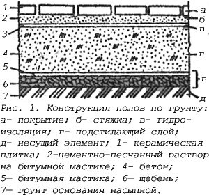 Полы – одна из основных строительных конструкций жилого помещения. Полы по грунту могут стелить либо непосредственно по грунту, либо с использованием лаг. Полы непосредственно по грунту наиболее дешевые, однако их можно устраивать только по сухим грунтам, именно тем грунтам, в которых наиболее целесообразно делать цокольный этаж или подвальное помещение. Для полов по грунту не требуются балки или плиты перекрытий, меньше расход теплозащитных материалов, но зато необходима более тщательная грунтовая подготовка. Подстилающий слой должен иметь ровную без выступов поверхность. «Одежда» монолитных полов по грунту может быть выполнена в виде цементной стяжки, керамических или бетонных плиток, безосновного линолеума, а также в виде дощатого или паркетного настила, уложенного на лагах по гидроизоляционному слою из рубероида или иной пленки. Полы по грунту с подпольем устраивают, как правило, в жилых помещениях. Обычно подполье (высота 1,5-2 м) делают утепленным с той же воздушной средой, что