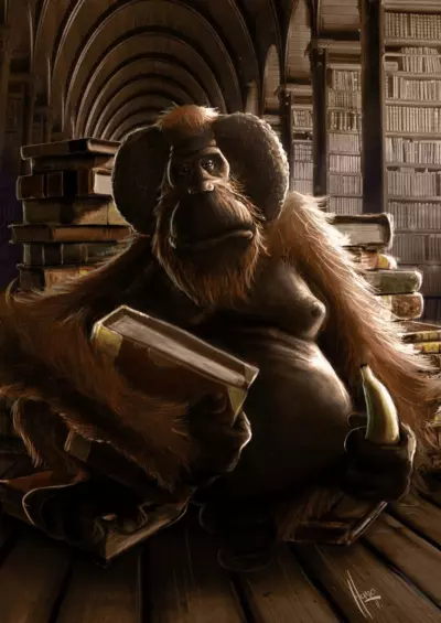 Ууг! Библиотекарь, библиотекарь -- это что-то с чем-то, представляющее из себя, на мой взгляд уникальный типаж персонажа, который Терри Пратчетт изобрёл, для нас -- бедных, со всей высоты своего литературного гения. С чего б начать… Пожалуй с того, что орангутаны крепко вошли в моё сознание и возбудили продолжительный интерес к антропологии, а также кошки и собачки потеряли все позиции в моём разуме после одного взгляда на это рыжее чудо. Наверное стоит сказать, что «ууг» и «оог« я активно использую в речи, как и «ку» с «кю», пришедшие ко мне поначалу из мультика, а позже из фильма «Киндзадза» замечательного Гии Данелии. - также при каждом посещении библиотек я стараюсь затеряться между полок, чтобы оказаться в плоском мире, но пока не вышло… Что такое Библиотекарь? Исходно библиотекарь вообще-то говоря человек, но был он таковым недолго, поскольку был превращён в орангутана/орангутанга (кому как больше нравится) , что ему настолько понравилось, что он отказывался от предложений по раз
