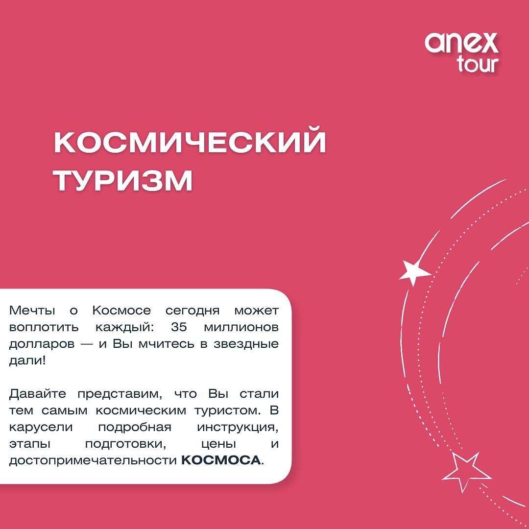 Вот и наступил тот знаменательный день, когда мы можем предложить нашим любимым путешественникам совершенно новое туристическое направление. 📍Близкое — всего 100 км и безграничное, безвизовое, но со строжайшими таможенными правилами, притягательное и совершенно не имеющее притяжения. Читайте наш новый пост, приуроченный ко дню космонавтики, в карусели. И помните — мы лишь фантазировали! 😁💫 #anextour #анекстур #туризм #космос #лето2022