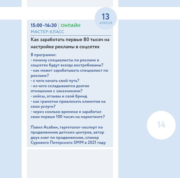 Завтра новый опыт. Расскажу, как можно зарабатывать специалисту по рекламе от 80к в месяц. Тут можно почитать тезисы. Выступление бесплатное, вдруг кто хочет тоже:)) P. S. Мероприятие организовано Центром Занятости при Правительстве Мск. #спикермаркетинг #асабинпавел https://cznmos.ru/raspisanie-treningov-po-samozanyatosti