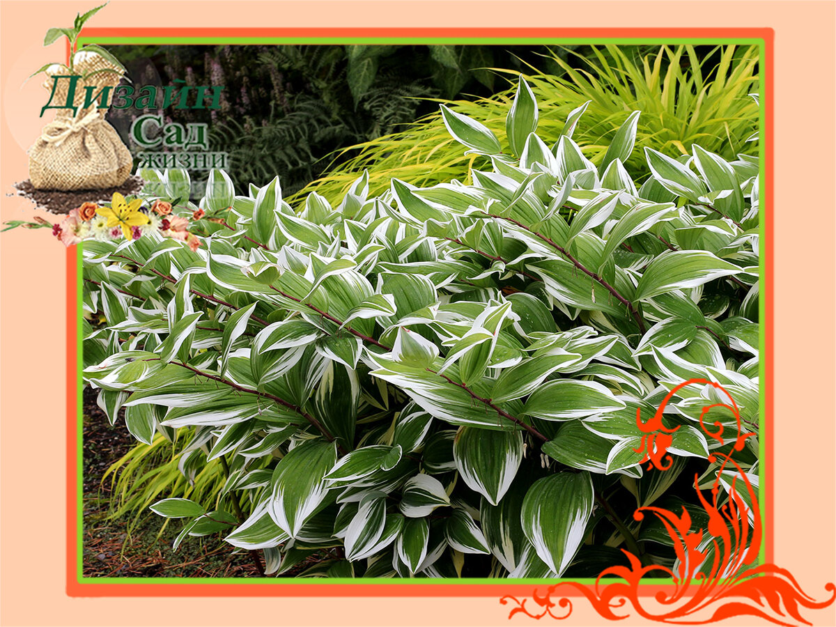 За счет белых полосок и пятен на листьях эти растения не только очень декоративны, но еще и подсвечивают тенистые участки вашего сада. 1. Купена серповидная Многолетник с четко-видными, утолщенными корневищами, высотой до 80 см. Ланцетные, продолговато-изогнутые листья этой садовой формы обрамлены по краю белыми полосками. Цветки зеленовато-белые, трубчатые, собраны по 1-6 штук. Распускаются в конце весны - начале лета. Этот вид не достаточно зимостоек, требует укрытия на зиму. К почвам не требовательна, но лучше растет на питательных, влажных. Не переносит застоя весенних вод. Отлично смотрится в тенистых местах. В партнеры подойдут хионодокса и пролеска, живучка, медуница, барвинок, яснотка, тиарка, дицентра, морозник, ясменник. 2. Диспорум сидячий Многолетник высотой до 60 см с ветвящимся стеблем и очень декоративными, продолговатыми, светло-зелеными, покрытыми белыми полосками и частично с белым краем листьями. Цветки зеленоватые, узкие, воронковидные распускаются в конце апреля и