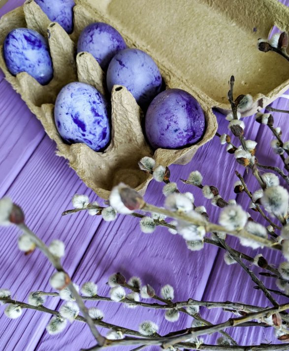 Удобнее всего использовать для окрашивания невысокий стакан. Наливаем в него получившуюся «краску». Рядом держим все нужные инструменты: столовую ложку, салфетки, таймер и сваренные белые яйца. С помощью ложки аккуратно опускаем в раствор яйцо. Засекаем 2 минуты. Вынимаем. Промакиваем салфеткой, избавляясь от влаги. Важно! Нужно лишь слегка промакивать салфеткой яйцо, а не вытирать его.