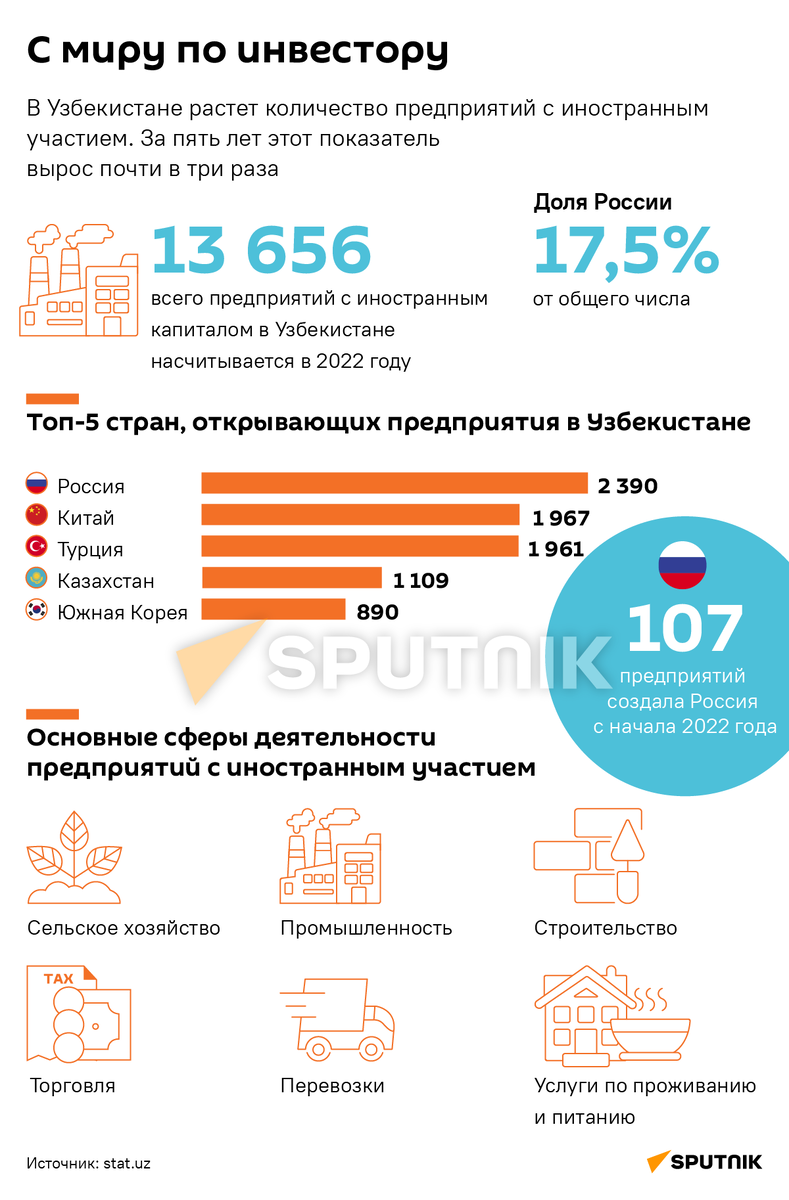 Россия занимает первое место по количеству открывающихся предприятий в Узбекистане. Только в этом году в республике открылось 107 новых российских компаний.