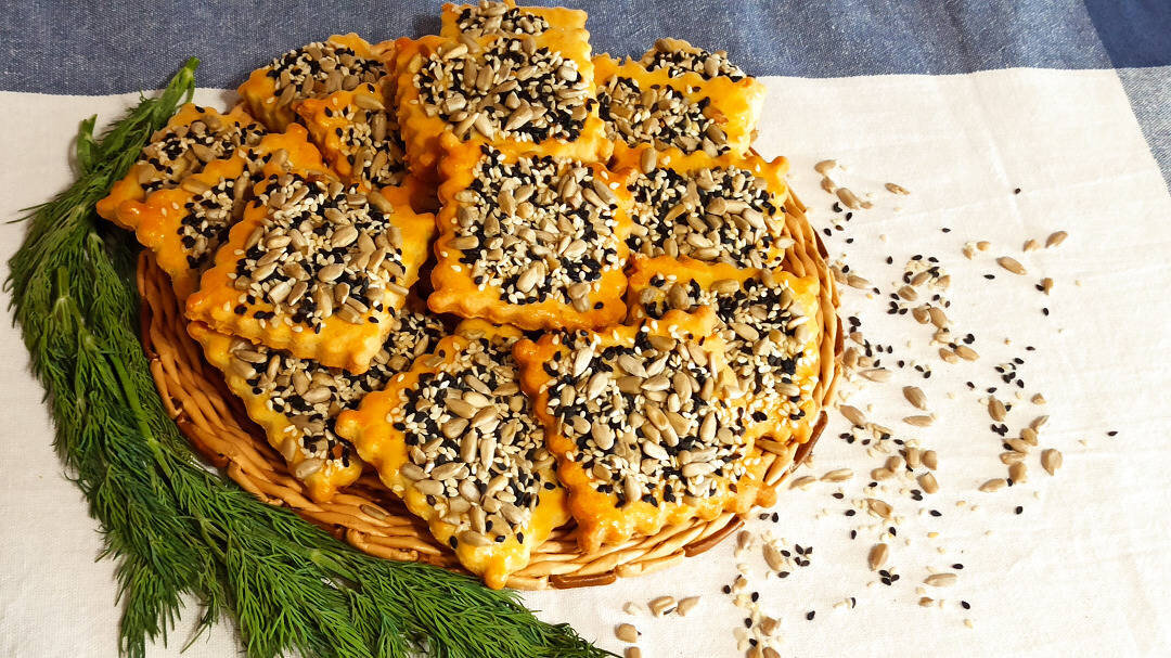 Ингредиенты: Пшеничная мука, Сливочное масло, Яйца, Семечки, Кунжут, Сахар , Соль , Разрыхлитель , Любви ❤️ Способ приготовления: Венчиком взбить 2 яйца с сахаром и солью. Далее добавить мягкое сливочное масло и смешать все в однородную массу. Соединить просеянную муку с разрыхлителем. Понемногу ввести муку в масляную смесь и замесить мягкое и эластичное тесто. Готовое тесто завернуть в пакет и убрать в холодильник на 40 минут. Охлажденное тесто раскатать в пласт, формочками вырезать заготовки печенья, выложить на противень, застеленный пергаментной бумагой. Заготовки смазать взбитым яйцом и посыпать семечками с кунжутом. Выпекать в разогретой до 180°С духовке 20-25 минут. 👩🍳 ПРИЯТНОГО АППЕТИТА! 👉 ВИДЕО РЕЦЕПТА: