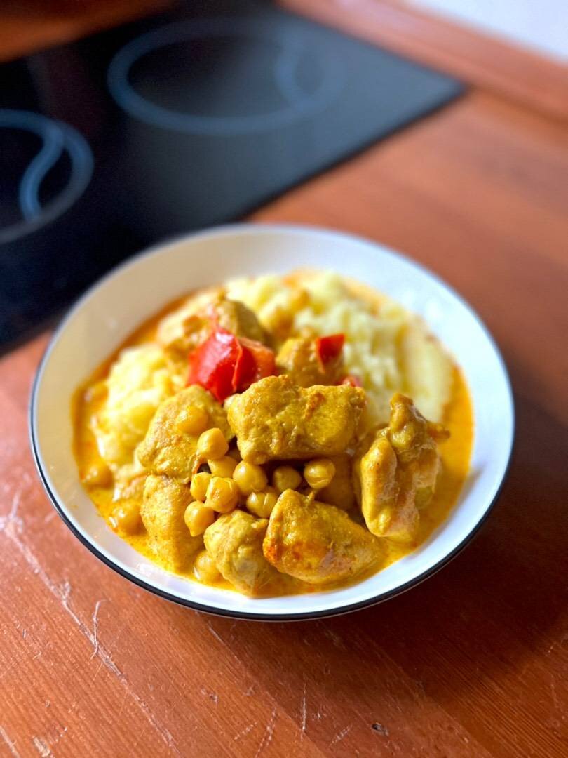 Курица в соусе карри с нутом - результат моих кулинарных экспериментов👩🏼🍳довольно часто готовлю это блюдо на ужин, и балую своих родных😋. Ингредиенты: Куриное филе, Нута сухого, Сливки 10%, Кипячёная вода, Крахмала кукурузного или картофельного, Белок, Карри, Соль, сахар, Куркумы, Паприки, Болгарский перец среднего размера Способ приготовления: Куриное филе нарезаем кусочками среднего размера. Не мельчите. Чем больше кусочек, тем более сочным он будет. Нут нужно заранее сварить, либо купить консервированный. К кусочкам куриного филе добавляем соль и карри по вкусу. Столовую ложку крахмала. Один белок. Тщательно перемешиваем и оставляем на полчаса. При обжаривании кляр запечатает сочность внутри филе. Этот лайфак подсмотрела у одного шеф-повара из Питера. Обжариваем кусочки на растительном масле до полуготовности, до появления корочки. Болгарский перец режем кубиком. Обжариваем в небольшом количестве растительного масла. Добавляем немного карри. Когда перец станет слегка мягким, до