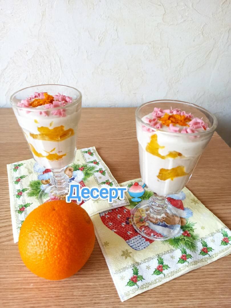 В высокий бокал налить немного крема. Уложить дольки апельсина. Ещё налить крем. И так дважды. Сверху украсить апельсиновой цедрой и шоколадом. Или на ваш вкус 😉😋