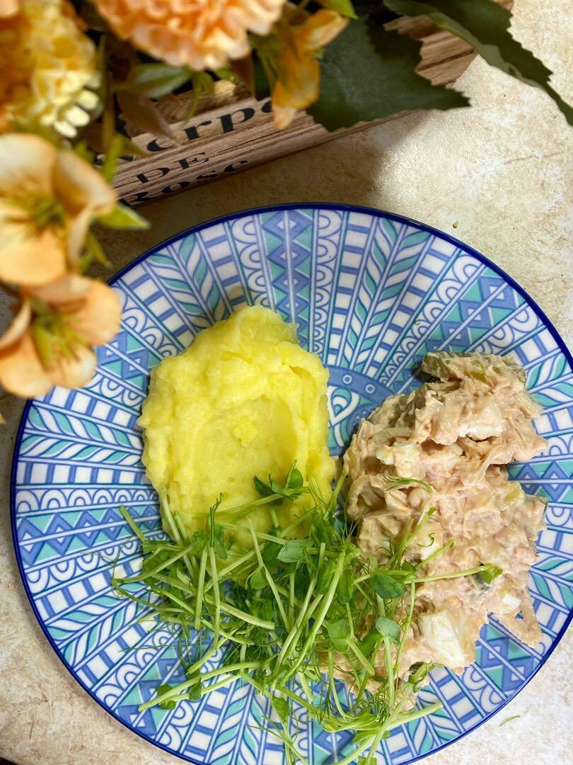 Ингредиенты: Печень трески, Яйца, Огурец маринованный, Лук опционально, Майонез