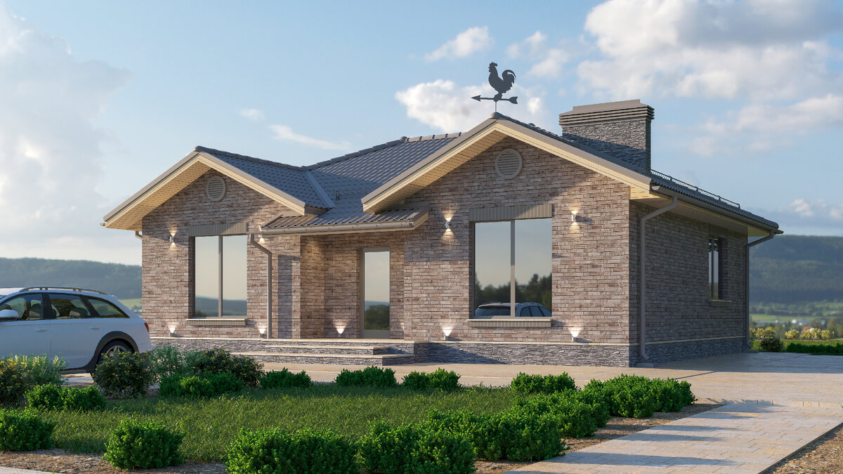 Лучше воробушек в гнезде, чем курочка в .... Строй небольшой дом и живи сразу! Интересная форма и внешний вид, не в виде ангара или прямоугольника. Симметричный внешний вид. Продуманные окна с учетом мебели. Вальмовая форма крыши с элементами фронтонов. Террас из гостиной не предусмотрено.