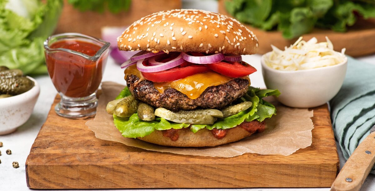 Ингредиенты для «Бургеры классические»: Булочка (домашняя по рецепту Покашеварим.) — 10 шт Говядина — 1 кг Жир (говяжий) — 150 г Сыр мягкий (или пластинками, или чеддер) — 20 шт Листья салата / Салат (айсберг или другой плотный и хрустящий салат; не надо брать нежные сорта салата, он просто размякнет в бургере и испортит его) — 1/2 шт Помидор — 2 шт Огурец (маринованный ) — 10 шт Лук красный — 2 шт Майонез — 2 ст. л. Горчица — 1 ст. л. Кетчуп — 2 ст. л. Соль — 1 ч. л. Перец черный — 1 ч. л. Время приготовления: 60 минут Количество порций: 19 Рецепт «Бургеры классические»: Сначала надо в мясе убрать все жилы и кожу. Потом провернуть его в мясорубке вперемежку с говяжьим жиром. Фарш перчим и вымешиваем в течение нескольких минут. Вообще его на этом этапе можно и посолить, но лучше посолить уже готовые котлеты перед самой жаркой, т. к. соль активизирует выделение влаги из мяса и пока котлеты будут у нас остужаться перед жаркой (а у нас будет такой этап) соки