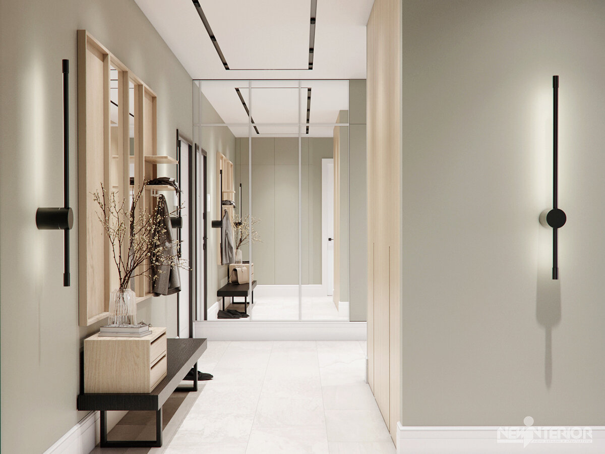 Друзья, позвольте представить вам наш новый проект текущего года, это квартира в Санкт-Петербурге, расположенная в ЖК Эталон на Неве. Общая площадь квартиры составляет 146 квадратных метров. В настоящее время мы создаём проект интерьера для семейной пары с двумя детьми. Начнём знакомство с холла. Интерьер мы выполнили в современном стиле с нотками скандинавского дизайна. На полу керамогранит в белом цвете, стены мы покрасим в приглушённо-оливковый оттенок. За скандинавский стиль отвечает натуральное дерево в естественных цветах, которое вы видите в дизайне мебельной композиции у входа и дверей платяного шкафа напротив. Если говорить о функционале — всё продумано. В холле есть зона открытого хранения верхней одежды, есть платяные шкафы со скрытыми фасадами, удобная скамейка у входа, ящик для ключей и мелочей и зеркало в полный рост. Этот вариант был первым и оказался единственным — он был утверждён сразу. Бюро дизайна и архитектуры Ольги Кулекиной