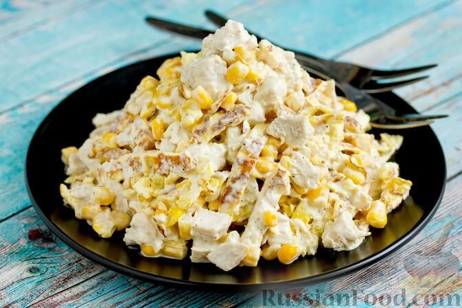 Салат с курицей, кукурузой и яичными блинчиками. Салат с жареными крабовыми палочками и грибами. Салат с куриными сердечками и солёными огурцами. Салат из фасоли с ветчиной, помидорами и сухариками. Салат "Коул-слоу" с сельдереем. Салат с жареными крабовыми палочками, грибами и яйцами очень вкусный и необычный. Изюминкой этого салата выступают крабовые палочки, которые предварительно нужно обжарить. Благодаря обжарке крабовые палочки становятся ароматнее и вкуснее. Салат "Коул-слоу" с сельдереем - один из удачных вариантов американского капустного салата с морковью и горчичной заправкой. По этому рецепту в салат добавляется не традиционный лук, а стебли сельдерея. Заправка - классическая для этого салата: из сметаны, майонеза и горчицы. Салат с куриными сердечками, солёными огурцами и яйцами идеально дополнит повседневное меню и даже праздничный стол. Салат получается сытным и вкусным. Нейтральный вкус варёных куриных сердечек и яиц дополнен солёными огурчиками, придающими блюду прият