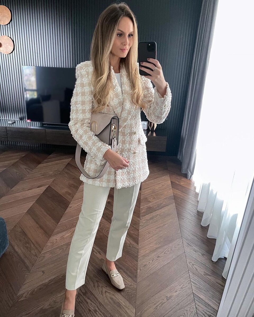 Повседневные вещи занимают большую часть дамского гардероба. На их основе можно составить множество простых и стильных образов как для прогулки или будничного шопинга, так и для более важных событий. Ниже 10 комфортных ансамблей на весну для вашего вдохновения! Образ в светлых тонах – идеальное решение для весеннего сезона. Клетчатый жакет теплого бежевого оттенка гармонирует с кремовыми брюками и лоферами. Стиль и комфорт в одном флаконе! Разбавьте черный total look клетчатым жакетом удлиненного кроя. Важно, чтобы это была модель из плотного трикотажа, качественный жакет всегда отлично садится по фигуре и при необходимости позволяет скрыть имеющиеся недостатки женского силуэта. Кардиган – незаменимая вещь в прохладные весенние дни. Кожаные скинни отлично сочетаются с мягким трикотажем и удобными лоферами с ненавязчивым декором. Не менее интересно на девушке смотрится удлиненный жакет в дуэте с платьем длины миди. Модель в рубчик выгодно "вытягивает" фигуру, стройнит, даже если дополни