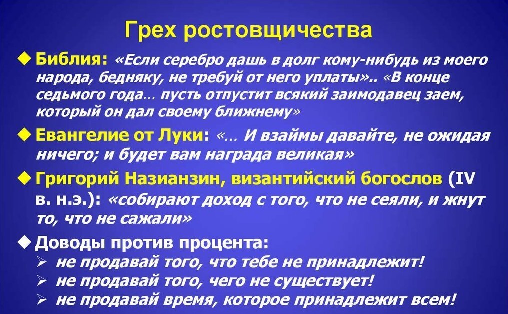 Есть такой грех лихоимство. Когда берут больше, чем заняли. То есть заняли 100 рублей, но с условием, что человек отдаст 120 рублей. Это грех. Православные никогда не дают под проценты в долг. Не сказано не берут. Если у меня нужда и я беру в долг в банке, это не есть грех, а вот если я даю, тогда грех. У меня может ребёнок умирает и нужны деньги на операцию, приходится брать под проценты, разные ситуации бывают. А вот если я, используя его нужду, наживаюсь на его горе, вот это преступление. В Псалтири прямо написано у кого есть надежда на Царствие Божие – у того, кто не давал деньги под проценты. Тот, кто давал, у того надежды нет, если не покается конечно. Вот в Казани была недавно пирамида, она брала деньги в долг, а возвращала с большими процентами. И люди кинулись, многие специально брали большие кредиты, чтобы вложить туда свои деньги и получить в разы больше. Человеку важен доход любой ценой, а Писание говорит нам, что не любой ценой. Не само действие, а что за этим стоит. Вот с