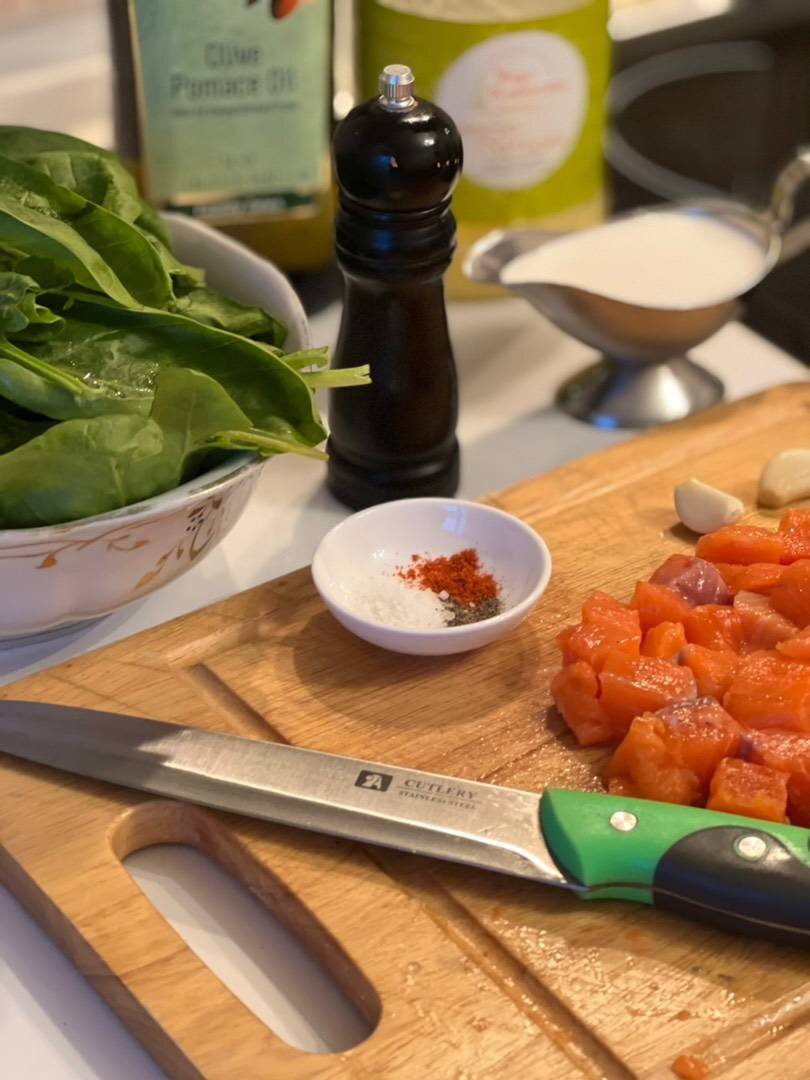 Ингредиенты: стейка форели, шпината, сливок 33%, спагетти, Сыр пармезан, чеснока, по вкусу Специи, оливковое масло, Спагетти, паста