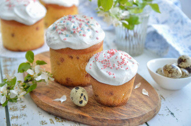 Для приготовления нам понадобится: Мука-400гр Сливочное масло-300 гр Сахар -250 гр Молоко -200 гр Яйца-4 шт Изюм -150 гр Лимонная цедра (цедра с одного лимона) Разрыхлитель 7 гр Соль - 0.5 гр Ванилин (на кончике ножа)по вкусу Подготовьте продукты для приготовления куличей. Они обязательно должны быть одной, комнатной температуры. Это важное условие для удачного теста - оно лучше поднимется при выпечке. Поэтому яйца и масло выньте из холодильника заранее, чтобы они успели согреться. Добавьте сахар в мягкое масло. Взбейте миксером масло с сахаром до пышной светлой массы. Не прекращая взбивать, добавьте по одному яйца. Удобнее будет это сделать, предварительно разбив их в отдельную посуду. Взбивайте массу до полного перемешивания продуктов. Лимон очень хорошо помойте под горячей водой. Лучше это сделать с содой, чтобы смыть воск, которым могут обрабатывать фрукты. Снимите с лимона цедру - верхний слой кожуры - натерев ее на мелкой терке. Не зацепите при этом белую часть лимона - она