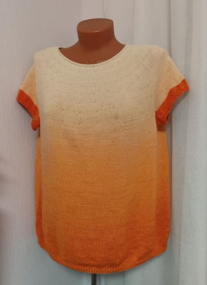 Футболка из 100% хлопка Связана эта футболка из хлопка Ализе Белла батик от горловины круглая кокетка супер короткие рукава, вернее полное их отсутствие, вязалась она легко и просто и как вы понимаете на мой размерчик одного моточка не хватило и заканчивала я свою прелесть уже бобинным хлопком на мою радость у меня был почти 1кг нужного мне апельсинового цвета. Мне кажется я ее нигде не публиковала, а может конечно мне кажется, но сегодня утром перед работой я обнаружила как же она хороша и сидит отлично и к телу приятная, на каких спицах вязала точно не скажу наверное на 3. Круглая кокетка лицевая гладь, все как я люблю. #ижевсквязание , #люблювязать , #круглаякокеткаспицами , #вязание и рукоделие , #вяжем спицами , #вязаниемоехобби