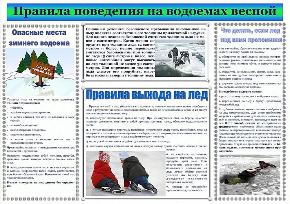 Щелковское ТУ ГКУ МО «Мособлпожспас» предупреждает Весной лед не прочен. Доброе утро дорогие друзья! Лед во время оттепелей крайне непрочен. Безопасным для человека считается лед толщиной не менее 10 см, пешие переправы считаются безопасными при толщине льда 15 см и более, при массовом катании – не менее 25 см. Но нужно иметь ввиду, что толщина льда на водоеме не везде одинакова: в устьях рек и притоках прочность льда ослаблена; лед непрочен в местах быстрого течения, бьющих ключей, там, где растет камыш, тростник и другие водные растения, в местах слива в водоемы теплых вод и канализационных стоков, на глубоких и открытых для ветра местах, у болотистых берегов, под мостами, в узких протоках. «Прочность льда можно определить визуально,- рассказывает заместитель начальника ПСЧ-305 Щелковского ТУ ГКУ МО «Мособлпожспас» Поповский Александр,- прозрачный лед голубого или зеленого цвета – прочный, если лед белого цвета – прочность его в 2 раза меньше. Серый, матово-белый или с желтоватым