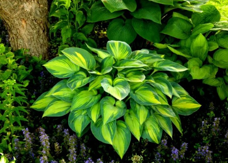 Хосты, японские колокольчики, цветки гномов – это название одного и того же растения, идеально подходящего для тенистых влажных мест. Из хост разной окраски листьев – зеленой, бело - и желто-окаймленной, отороченной красными ободками, с цветами всех оттенков синего и голубого, белого и розового можно создать неповторимый, цветущий и благоухающий ковер-узор. Многие сорта зарубежной селекции не выдерживают бесснежных поздних осенних заморозков, а при укрытии легко выпревают. Исходя из многолетнего опыта выращивания, рекомендуем следующие сорта. Хоста Мармората с крупными сердцевидными листьями, они отрастают с первыми тёплыми днями, блестящие, плотные и вначале имеют ярко-зеленую окраску с желтыми полями. По мере отрастания становятся равномерно темно-зелеными, с чётким, как бы чеканным рисунком жилок. Высота растения около 30 см. Цветёт в июле- августе в зависимости от места произрастания (чем тенистее место, тем позднее и продолжительнее цветение). Из каждой розетки распускается по од