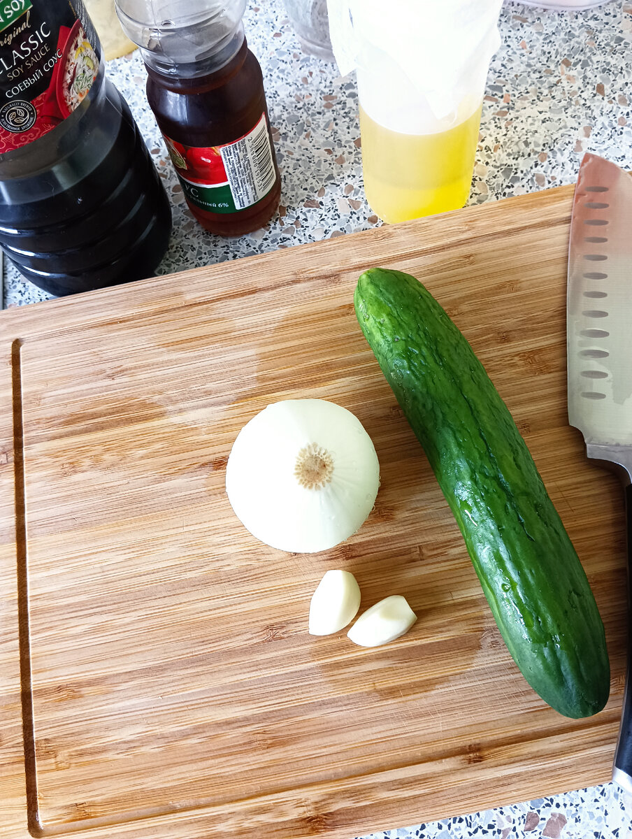 Привет читатель! Сейчас пойдет речь о очень простой и быстрой закуске, салата, в азиатском стиле. Бывают разные ситуации, пришли гости, или друг с чем ни-будь горячительным. А поставить на стол нечего, есть только огурец и специи. И из этой ситуации есть выход. И так, нам понадобится то, что всегда есть в холодильнике: огурец, луковица, два зубчика чеснока, соевый соус, яблочный уксус, масло растительное и специи. Черный перец, горчица, и поскольку это азиатский мотив то кориандр, сахар, для остроты красный перец. Благо специи и соусы у нашего брата хранятся долго. Замешиваем эмульсию. К специям добавляем соевый соус и масло, для остроты красный перец. Нарезаем основной продукт, нарезать нужно тонко, я нарезал так. Соединяем все ингредиенты, даем настоятся минут 5 и можно подавать. Для красоты пару щепоток кунжута. Приятного аппетита! #Еда #огурцы #закуска #огуречный салат #салат из огурцов #на скорую руку #азиатский стиль