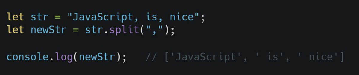 Метод split(separator, limit) позволяет преобразовать строку в массив. `separator` - это необязательный параметр. Он определяет символ, или регулярное выражение. Если вы не предоставите разделитель, он вернет полную строку в виде массива. `limit` - это необязательный параметр. Он определяет, сколько раз следует разделить совпадающее значение. Если лимит не указан, то он будет разделен на все совпадающие значения и вернет массив. Разобьем строку на массив строк: Вывод: Удалим пробелы: