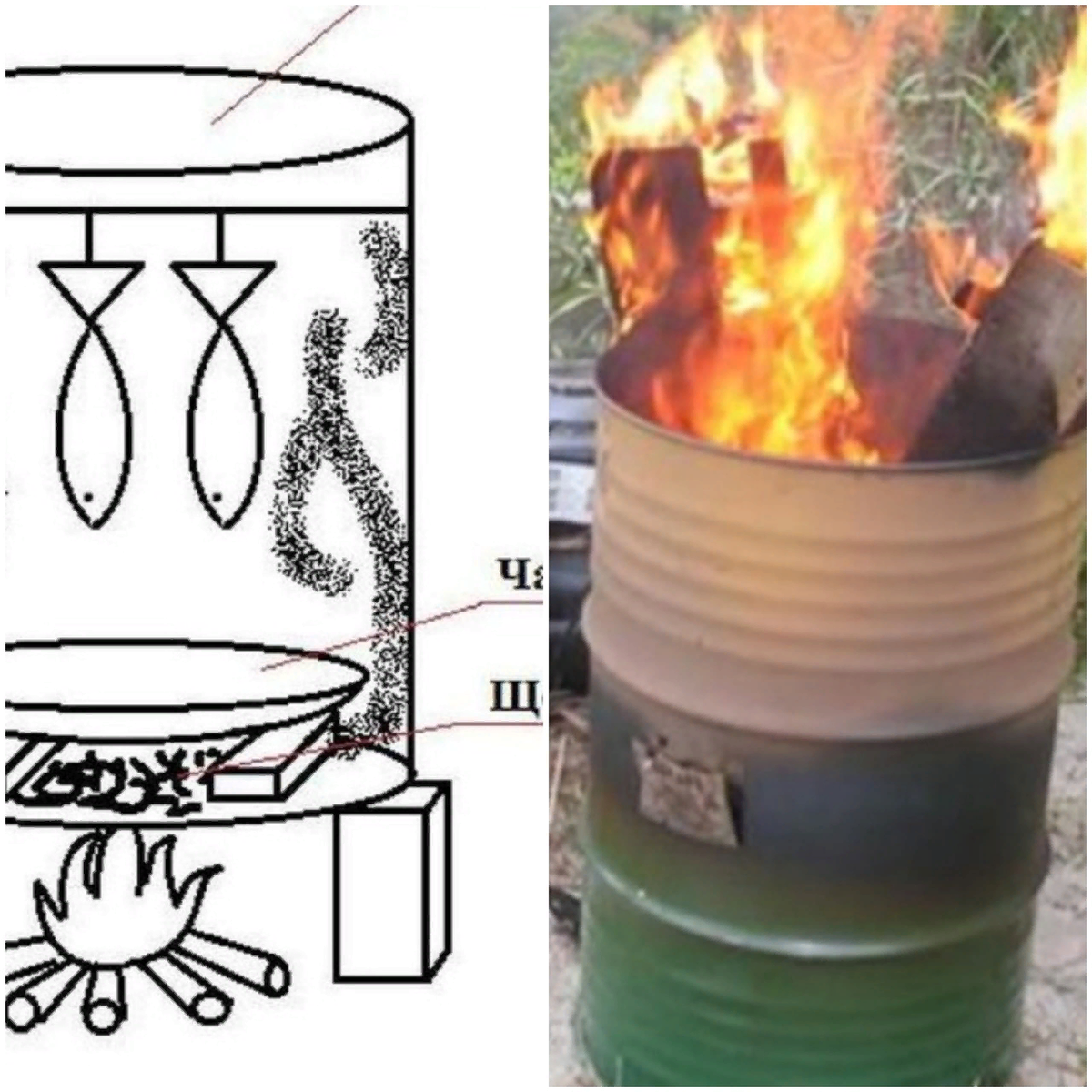 Приветствую дорогой читатель. Если честно, я долго думала над темой для сегодняшней статьи, и как всегда в приоритете идей выбираю то, что хочу сделать самостоятельно. Мысль о коптильне уже давненько гуляла в моей голове, но вот руки как-то не доходили разобрать тему досконально. А с тем учётом, что сейчас идёт череда весенних праздников, и выбор у нас в магазинах очень даже ограничен, время разобраться с коптильней самое подходящее. Я пересмотрела не мало видео роликов, и была очень поражена, чего люди только не приспосабливают под это и дело и старые печи, и холодильники и сложнейшие конструкции из кирпича и древесины. Но, если бюджет ограничен, а времени мало, можно вполне обойтись бочкой и парочкой комплектующих. Итак, начнём подробнее. - Для начала нам нужна бочка, которую нежно хорошо очистить и обпалить. (если специальных приспособлений для этого нет, достаточно будет развести там хороший костёр). - Далее в верхней части бочки нужно вырезать люк, тут нужна будет болгарка. И Ря