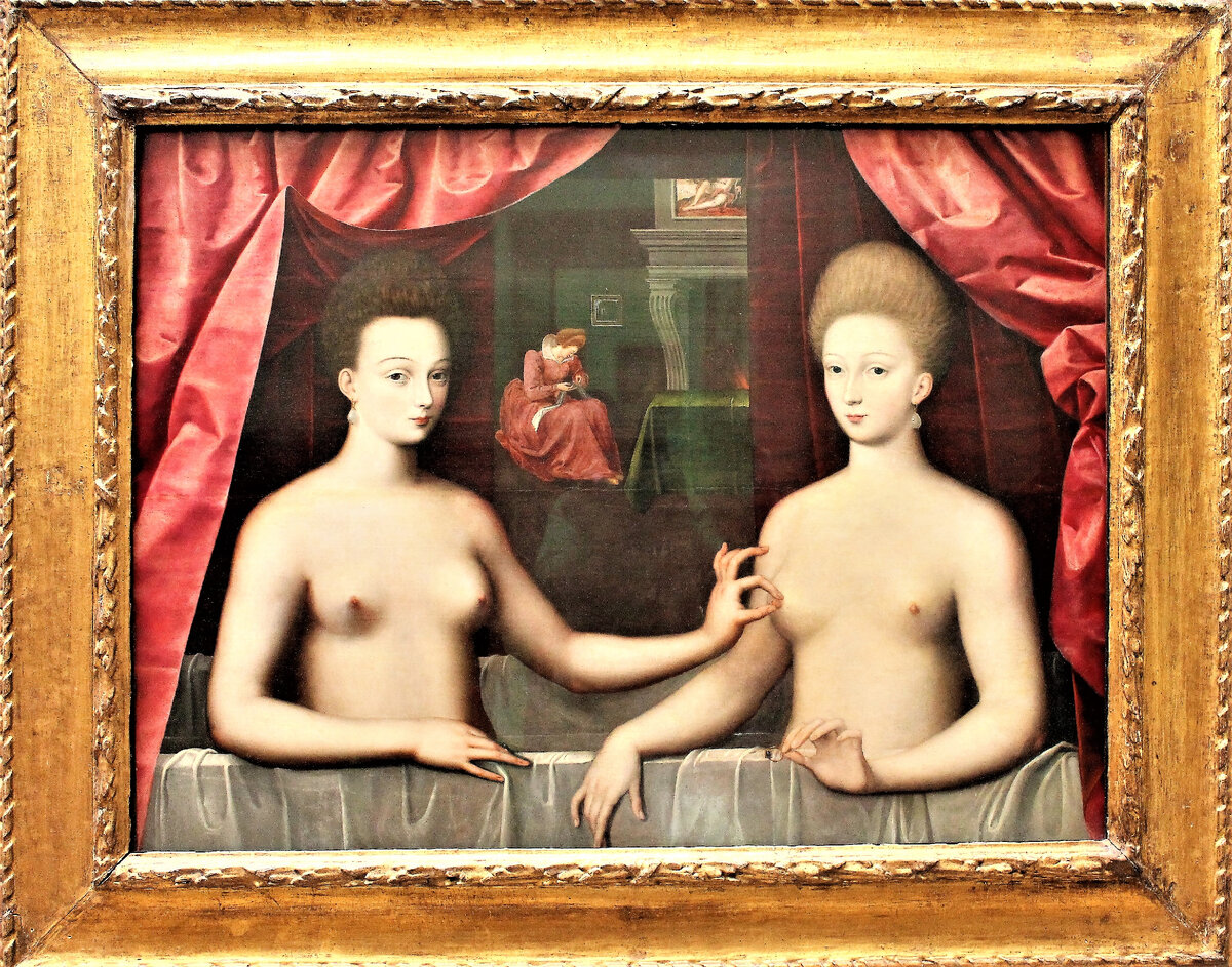 Признаюсь, поначалу сюжет данной картины мне показался неясным. Портрет Габриэль д’Эстре с сестрой, так называется произведение неизвестного художника школы Фонтенбло, не совсем обычен, как по форме, так и по содержанию.