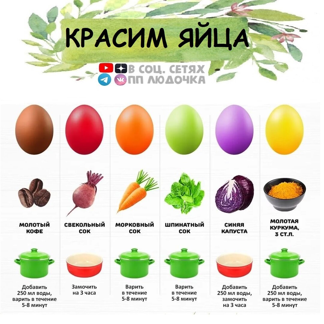Лайфхаки по окрашиванию яиц натуральными красителями 💡 Они помогут достичь наилучшего эффекта, прикладывая к этому процессу минимум усилий. Итак, внимание 🤓 ✅ Для того, чтобы натуральная краска ложилась на яйцо как можно ровнее и лучше «приставала» к скорлупе, протрите их, при помощи ватки, уксусом кухонным (9%), или водой, в которой растворено небольшое количество соды. ✅ Чтобы яйца не трескались в воде при варке, не стоит класть их в кипяток. Кладите их сразу в посуду, заливайте холодной водой и только потом — ставьте на огонь. ✅ Яйца сварятся быстрее, если перед процессом их варения, за 1 час до него, вы подержите их при комнатной температуре воздуха. ✅ Чиститься яйца будут куда лучше, если вы, после их варки, сольете кипяток и зальете их холодной водой, подержав их в ней минут 10. ✅ Яйца лопаются в кипятке? Этого не произойдет, если воду посолить. И даже если образуется небольшая трещинка, то содержимое не вытечет. ✅ Шикарный блеск уже окрашенным яйцам обеспечен, если их,