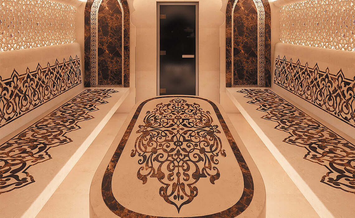 Роскошный хамам, отделанный мрамором, золотой мозаикой, резными узорами в восточном стиле создали мастера нашей компании «Твой пар».