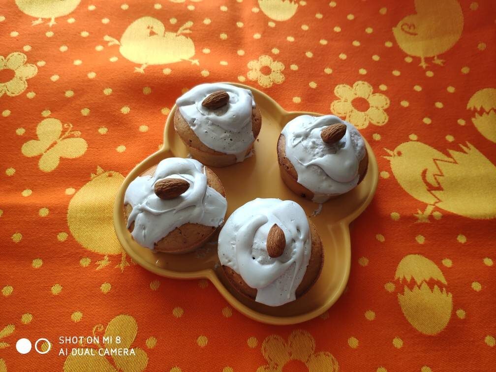 Ингредиенты: Для куличиков:, кефир, сахар, яйца, рисовая мука, овсяная мука, семола, орех грецкий, изюм, разрыхлитель, сливочное масло, апельсиновая цедра/ опционально, Для глазури:, сахар, вода, желатин