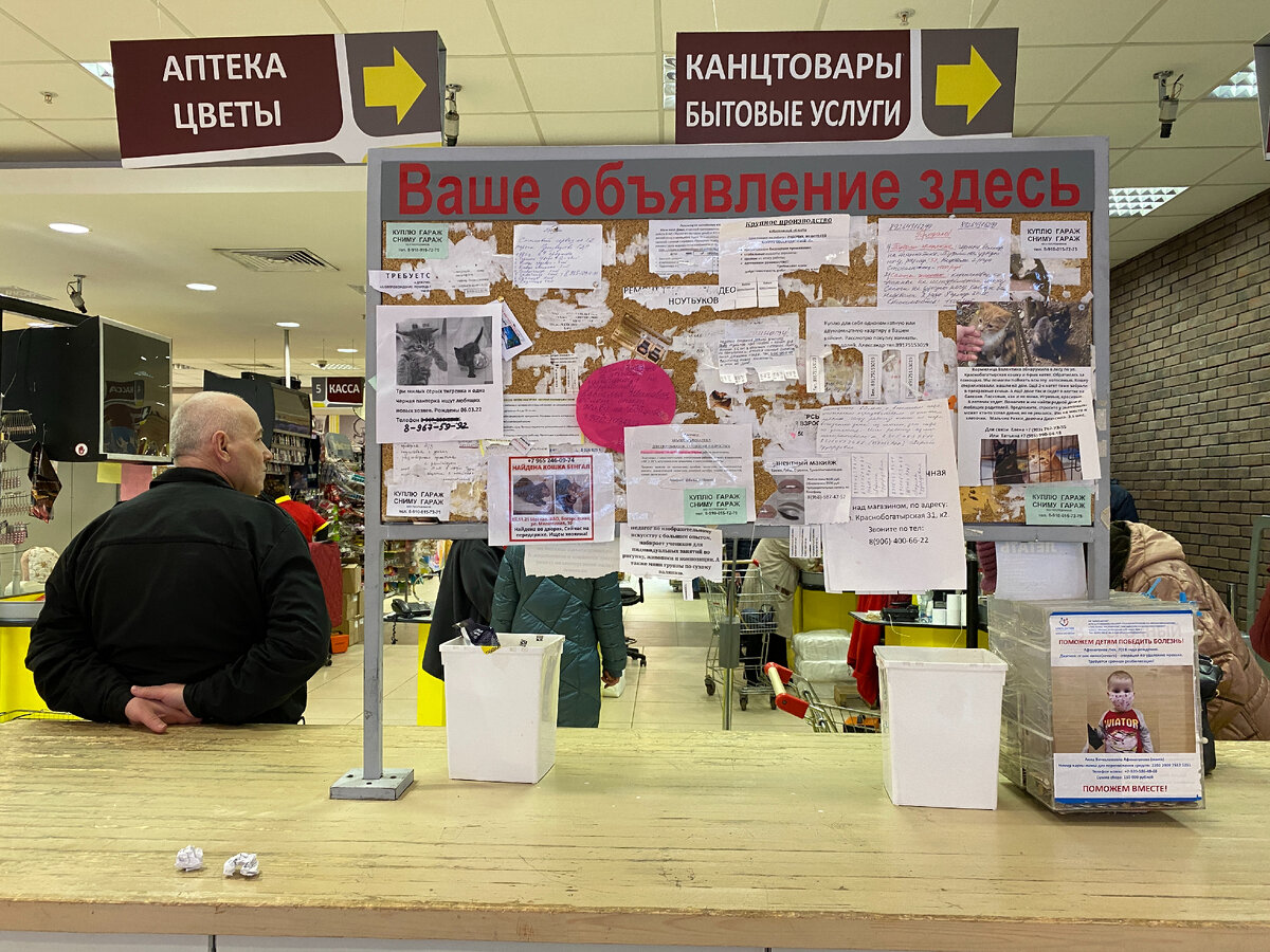 Мои постоянные читатели знают, что интересует меня далеко не только еда. Но ещё путешествия — и устройство разных городов: как они устроены, как и чем в них живут люди. Собственно, меня и еда интересует не только сама по себе, но и как важная часть человеческой культуры. И вот интересный городской случай, про который я хочу вам рассказать. У нас, в московском районе Богородское, есть такой торговый центр: «Бэмби». Раньше это был большой детский магазин, а потом помещение разделили, и теперь там универсам, небольшая кофейня с выпечкой, аптека, зоомагазин, ателье и ещё десятка полтора разных лавочек. Люди в основном приходят туда за продуктами, ну и параллельно что-то ещё покупают, чинят, общаются. Общаются — это важное слово: с помощью одного простого средства «Бэмби» стал больше, чем магазином. Из обычного районного супермаркета с добавками он превратился в средство коммуникации. Там поставили доску для объявлений, где каждый может разместить своё. Вот так она выглядит. В Москве и с
