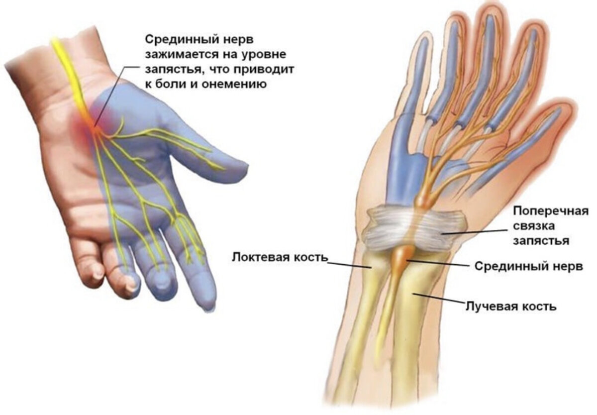 Синдром запястного канала (запястный туннельный синдром) — неврологическое заболевание, проявляющееся длительной болью и онемением пальцев кисти. Возникает он из-за того, что у основания ладони срединный нерв оказывается зажатым в узком канале между костями, поперечной связкой и сухожилиями мышц запястья. Это заболевание возникает у людей, профессиональная деятельность которых требует длительного сгибания пальцев (переноска тяжести, водитель, массажист, стоматолог, пианист, шахтёр и пр.) или частого стереотипного движения кистей рук (сурдопереводчик, автомеханик, барабанщик, художник, плиточник, каменщик и пр.). Но основную часть пациентов составляют, конечно же, пользователи компьютеров и игровых приставок. Заболевание обычно проходит пять стадий. Начальным симптомом является утреннее онемение рук, на которое редко кто обращает серьёзное внимание. Тем более, что оно достаточно быстро само проходит. Появление ночных приступов парестезий и болей говорит о наступлении второй стадии