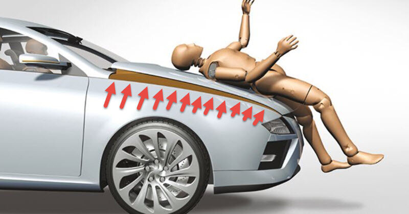 Устройство предвидит наезд на пешехода, подготавливая капот автомобиля к оптимальному для безопасности углу встречи.