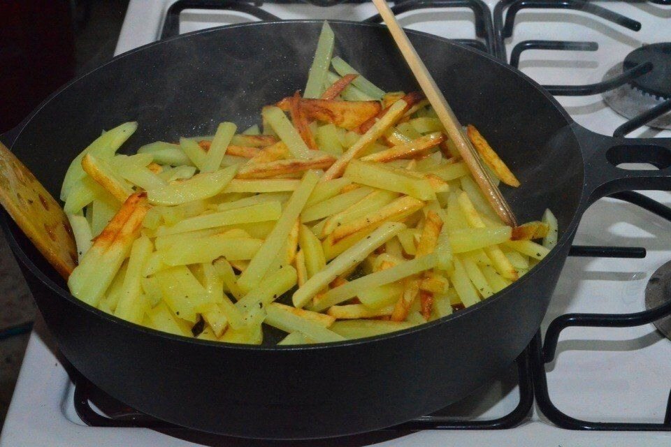 Вкусная жареная картошка с запеченным мясом!!! Тут появилось много рецептов жарки картошки и согласно авторов она вкусная,хотя они такое там вбухали,что решил написать простой свой рецепт,думаю что многие так делают,а никак эти горе повара!!! Состав: Картофель - 8 шт. Лук репчатый - 1 средний Лук зелёный - 1 пучок Чеснок - 2 дольки Укроп - 1 веточка Соль,черный перец по вкусу Свинная шея( целый кусок),чеснок,перец черный и лавровый лист Приготовление: Очищенную картошку нарезаем соломкой и начинаем жарить в открытом состоянии до легкой корочки,к ней добавляем лук кубиками и жарим до золотистой корочки,потом добавляем соль,перец и мелко нарезанный зелёный лук,укроп,чеснок, можно ещё и кинзу( кто любит),все перемешиваем и накрываем крышкой на 2 минуты и выключаем!!! Вкусная картошка готова! В мясе делаем небольшие надрезы,чтобы туда можно было поместить чеснок кубиками небольшими,дальше сыпем со всех сторон перцем и солью и немного натераем,дальше заворачиваем в фольгу плотно и где т