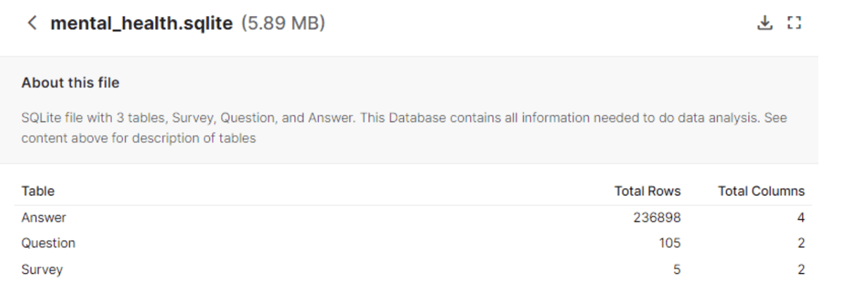ΠΠ»Ρ Π²ΡΠΏΠΎΠ»Π½Π΅Π½ΠΈΡ SQL-Π·Π°ΠΏΡΠΎΡΠΎΠ² Π½Π°ΠΌ Π½Π΅ΠΎΠ±Ρ ΠΎΠ΄ΠΈΠΌΠΎ Π·Π°Π³ΡΡΠ·ΠΈΡΡ Π±Π°Π·Ρ Π΄Π°Π½Π½ΡΡ SQLite Π΄Π»Ρ Kaggle Mental Health in the Tech Industry ΠΏΠΎΠ΄ Π»ΠΈΡΠ΅Π½Π·ΠΈΠ΅ΠΉ CC BY-SA 4.0. ΠΠ°Π·Π° Π΄Π°Π½Π½ΡΡ ΡΠΎΠ΄Π΅ΡΠΆΠΈΡ ΡΡΠΈ ΡΠ°Π±Π»ΠΈΡΡ: "ΠΠΎΠΏΡΠΎΡΡ", "ΠΡΠ²Π΅ΡΡ" ΠΈ "ΠΠΏΡΠΎΡ".