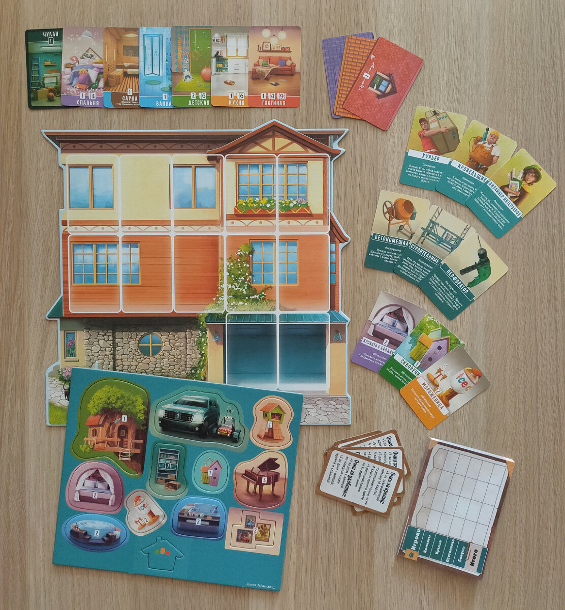Всем привет! Сегодня хочу рассказать о недавно приобретённой нами игре "Домик". Взахлёб играем в неё уже несколько дней и интерес только возрастает. Игра предназначена для 2-4 человек. Сразу посоветую, при игре вдвоём обустраивать по два домика каждому (т.е. играть за четверых) и в финале суммировать свои очки. Так намного интереснее. Но если играют маленькие дети, то лучше придерживаться общих правил. В составе игры 1 игровой планшет, 4 планшета домов, 4 памятки, 60 карт комнат, 48 карт ресурсов, 11 жетонов обстановки, жетон первого игрока и блокнот для подсчёта очков. Всё это представлено в большой, красочно оформленной коробке. Игра простая. Каждый игрок получает по дому и памятке. В центр помещается игровой планшет, на котором располагаются карты комнат и ресурсов. Игра продолжается 12 раундов. В свой ход игрок должен выбрать столбец на игровом планшете и взять две карты - комнату и ресурс. Комнату нужно сразу расположить в доме, а ресурс использовать согласно тексту на карте.