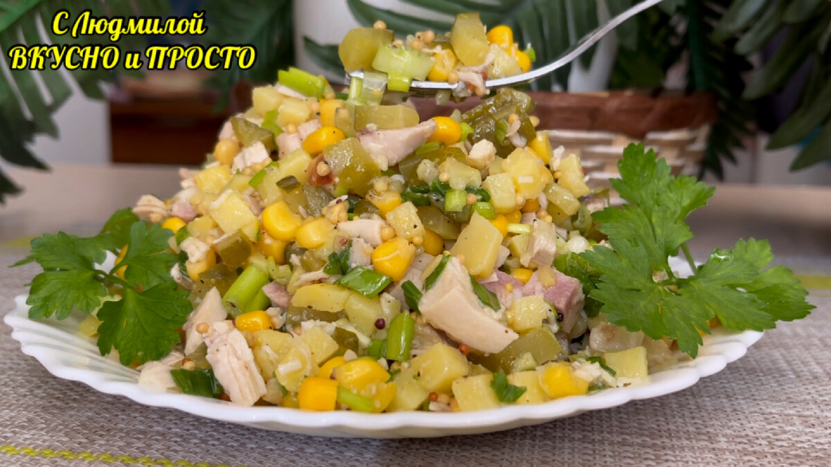 Для приготовления таких салатов я специально ничего не заготавливаю, использую то, что есть в холодильнике. Салаты получаются очень вкусные, сытные, абсолютно недорогие. Итак начнём. Немного мяса с косточек, что варились на бульон, мелко режем. Мясо может быть любым. У меня сегодня курица. Варёный картофель режем на небольшие кубики. Кстати, специально картофель я не варила, остался от предыдущего рецепта. Также в салат добавим немного маринованных огурчиков, которые мелко режем. А ещё у меня был хороший пучок зелёного лука, его тоже мелко режем. Выкладываем в чашу все подготовленные продукты: картофель, мясо, огурцы. А ещё я решила добавить в этот салат для вкуса немного консервированной кукурузы. Выкладываем в чашу зелёный лучок и добавляем пару ложек горчицы в зёрнах. Горчица - не обязательный ингредиент, но если она есть, добавьте (с ней вкуснее). Заправляем салат растительным маслом для салатов (тем, которое с ароматным запахом). Ну и перемешиваем наш салат. Только после