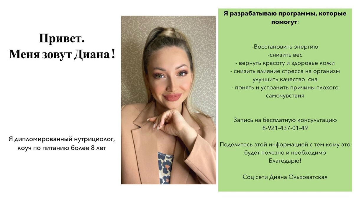Привет 👋 Меня зовут Диана Я- нутртциолог, коуч по питанию . Если ты хочешь: 🔥снизить вес без жестких диет и подсчета калорий 🔋вернуть состояние бодрости и энергичности 💪🏼сделать чекап организма и восполнить витамины 🍩перестать заедать эмоции и стресс ✔️Я помогу тебе достичь желаемого веса и ресурсного состояния - без подсчета калорий, жестких ограничений и мучительных тренировок В результате- ты здоров, полон энергии и твой доход растёт ↗️ Запишись на бесплатную консультацию 👉@dianaolh , где мы разберём твою задачу и я помогу с её решением . 🎁Подпишись на мою группу в вк https://vk.com/clubdianaolhov