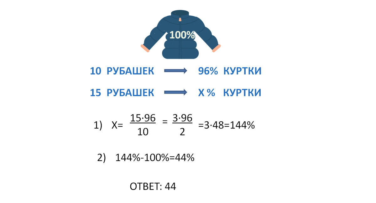 В разных сборниках для подготовки к ОГЭ можно встретить две задачи в задании 21, которые решаются очень просто. Давайте посмотрим как можно быстро получить дополнительные два балла в копилку. ЗАДАЧА №1 Десять одинаковых рубашек дешевле куртки на 4%. На сколько процентов пятнадцать таких же рубашек дороже куртки? Если принять стоимость куртки за 100%, то десять рубашек будут стоить 96% от стоимости куртки (100%-4%) Составляем пропорцию и раскрываем "крест на крест", далее находим разность стоимости пятнадцати рубашек и стоимость одной куртки в процентах: ЗАДАЧА №2 Свежие фрукты содержат 93% воды, а высушенные – 16%. Сколько требуется свежих фруктов для приготовления 21 кг высушенных фруктов? В этой задаче уравнение будем составлять по массе сухого вещества (т.к. эта величина остается постоянной и в свежих фруктах, и в высушенных). В свежих фруктах содержание сухого вещества равно 7% ( из 100% исключаем 93% воды), а высушенных - 84% (из 100% исключаем 16% воды). Но масса сухого вещества