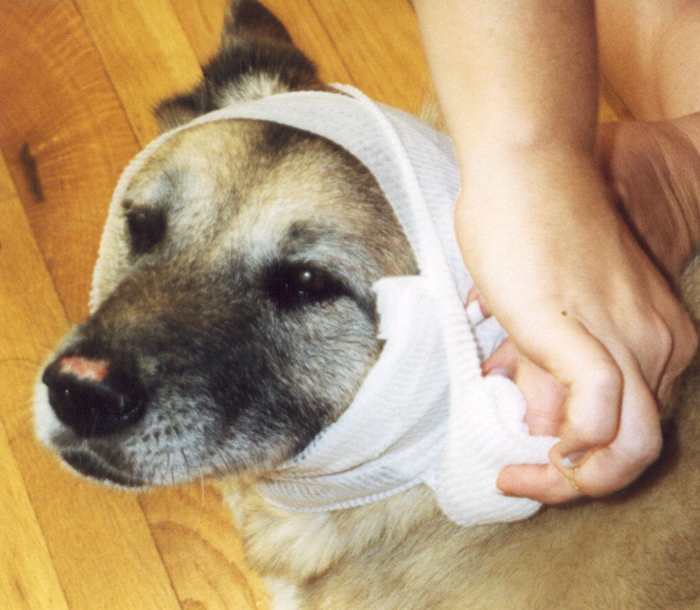 Глубокие проникающие, рваные раны с загрязнением Такие повреждения требует срочного вмешательства со стороны владельцев, четкой организации лечебного процесса: Успокойте собаку, зафиксировав ее в удобном для проведения обработки положении. Аккуратно ножницами выстригите шерсть возле зоны поражения. Удалите из раны стерильным пинцетом сторонние предметы. Хорошо несколько раз промойте рану антисептическим, обеззараживающим раствором. Края раны обработайте зеленкой, йодом. Следите, чтобы препараты не попали в рану. Остановите кровотечение, используя кровоостанавливающие препараты. После остановки кровотечения наложите антибактериальную, ранозаживляющую мазь (Левомиколь). Рану прикройте марлевой салфеткой. Сверху наложите стерильную бинтовую повязку. Важно! После оказания первой помощи, если пес получил глубокие раны, сопровождающиеся болевым шоком, кровотечением отвезите собаку в ветклинику. Если уверены, что хорошо удалили из раны все загрязнения, в дальнейшем раненую поверхность обрабатывают два-три раза в сутки. Следите за стоянием собаки, процессом заживления. Измеряйте температуру. В случае ухудшения состояния собаки, если началось нагноение, свяжитесь с ветеринаром.