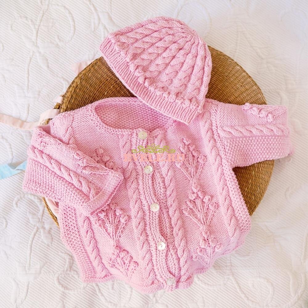 Чудесный комплект для девочки связанный спицами состоит из кофточки и шапочки.
