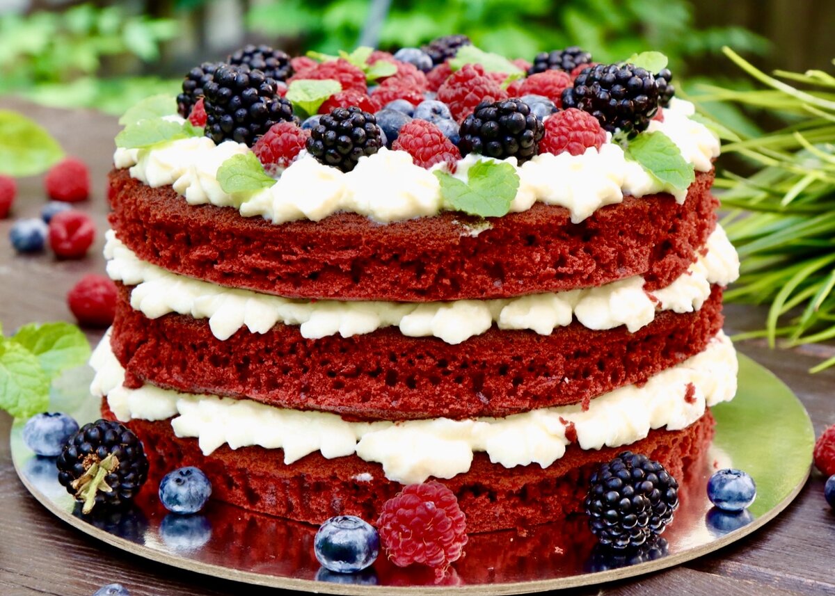Здравствуйте дорогие подписчики и гости моего канала, сегодня хочу поделится с вами рецептом вкуснейшего торта Красный Бархат. Рецепт для тех у кого нет духовки. Такие торты обычно пеку летом на даче, но недавно делала дома, т.к. перегорела духовка. Рецепт отличный, коржи выпекаются быстро. Итак, начнём Размягченное сливочное масло взбиваем миксером далее добавляем сахар и ещё немного взбиваем Затем к маслу добавляем по одному яйцу и продолжаем взбивать В молоко добавляем гелевый краситель, размешиваем и выливаем к яйцам и маслу. Сюда же добавляем растительное масло Затем в отдельной емкости просеиваем и смешиваем сухие ингредиенты Все хорошо перемешиваем и добавляем к остальным продуктам Тесто делим на 3 равные части, я для удобства использовала 3 одинаковые миски 1/3 теста выливаем на холодную сковороду, и ставим на медленный огонь ( можно чуть ниже среднего, но смотрите по своей плите) выпекаем корж под крышкой минут 10 Выпеченный корж переворачиваем на тарелку и так же выпекаем