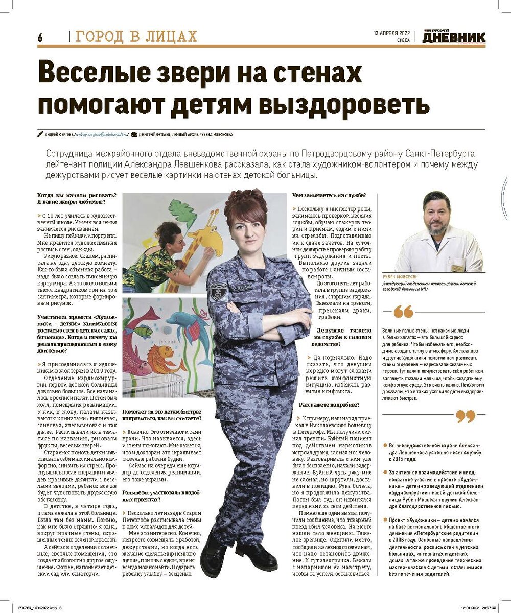 В газете "Петербургский дневник" от 13 апреля 2022 года опубликована статья "Весёлые звери на стенах помогают детям выздороветь" (автор: А.Сергеев) — о лейтенанте полиции Александре Левшенковой, сотруднице межрайонного отдела вневедомственной охраны по Петродворцовому району Санкт-Петербурга, которая рассказала о своей службе в Росгвардии, решении стать художником-волонтером проекта "Художники - детям" и украсить стены кардиохирургии Детской городской больницы весёлыми картинками.