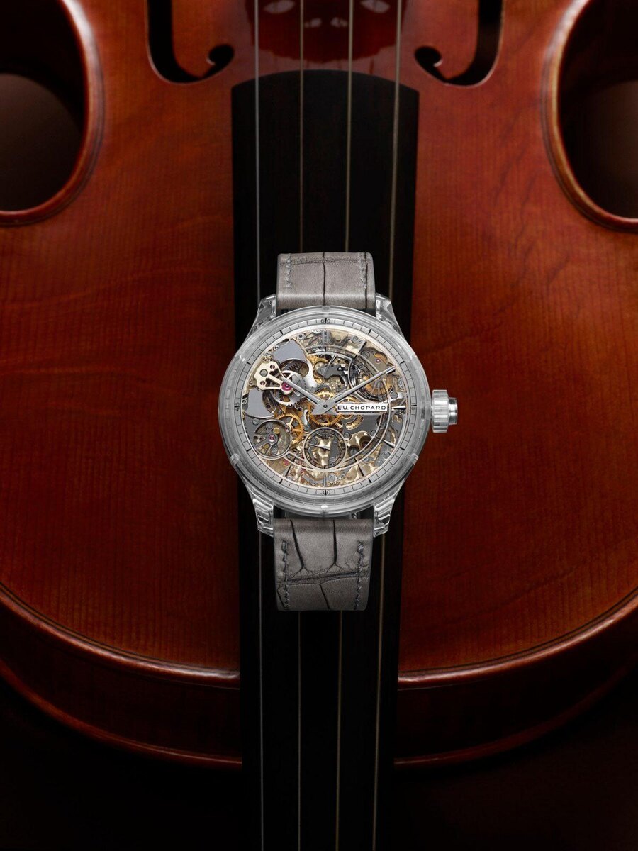 Часы L.U.C Full Strike Sapphire с естественным блеском и инновационным дизайном — это часы с минутным репетиром в полупрозрачном сапфировом корпусе, через который открывается беспрепятственный обзор одного из самых сложных калибров Chopard. Было подано пять патентов на механизм L.U.C 08.01-L, состоящий из 533 деталей, который отбивает часы, четверти и минуты на гонгах из прозрачного сапфирового стекла, производя совершенно чистый звук, уникальный в мире.